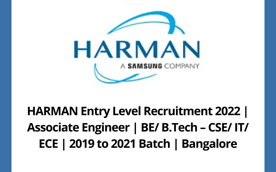 HARMAN Entry Level Recruitment 2022 | Associate Engineer | BE/ B.Tech – CSE/ IT/ ECE | 2019 to 2021 Batch | Bangalore