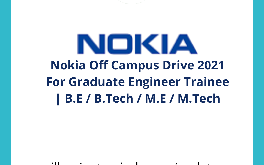 Nokia Off Campus Drive 2021: Nokia Off Campus Drive 2021 For Graduate Engineer Trainee. B.E / B.Tech / M.E / M.Tech / MCA candidates can apply. The detailed eligibility and application process are given below.